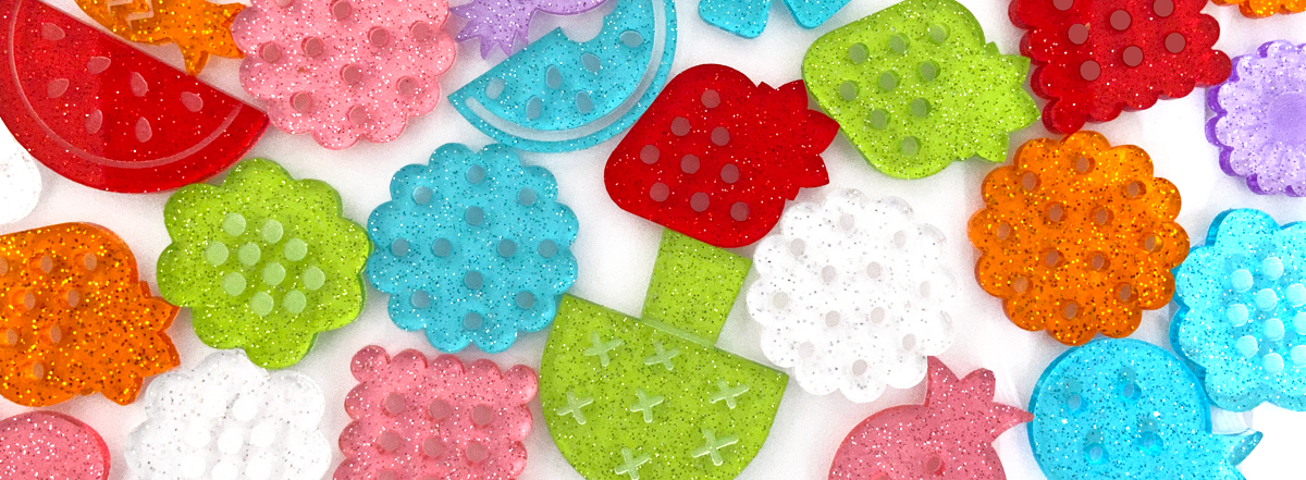 High gloss finish on both sides. Coloured transparent acrylic with small speckles of glitter throughout.